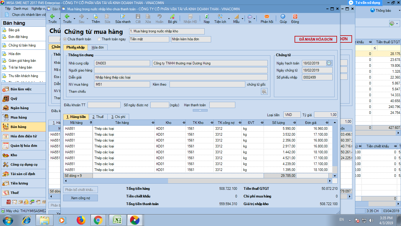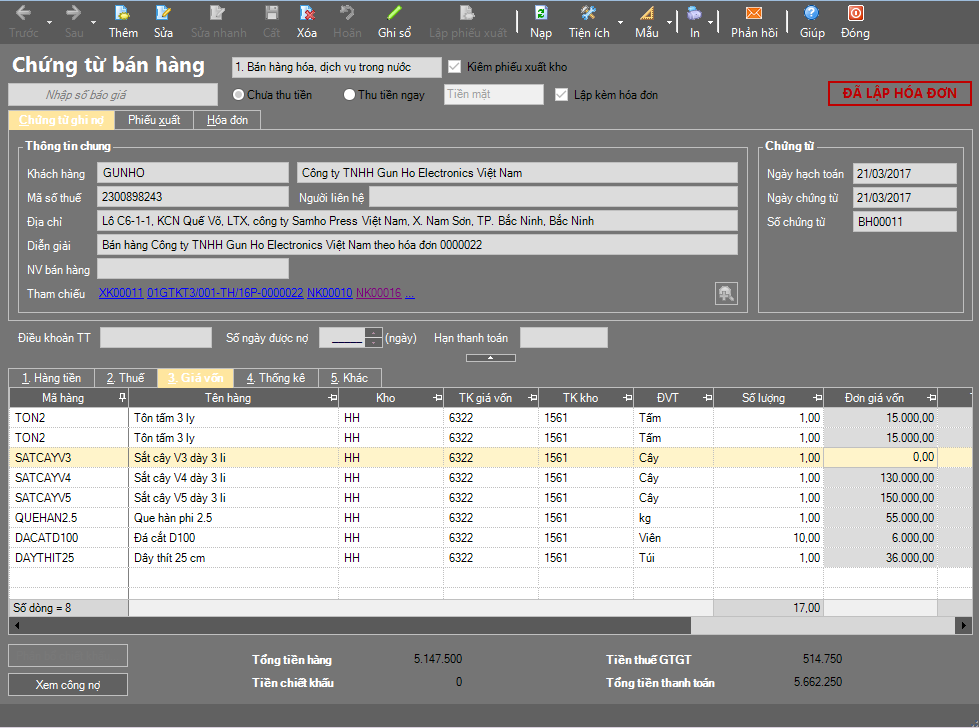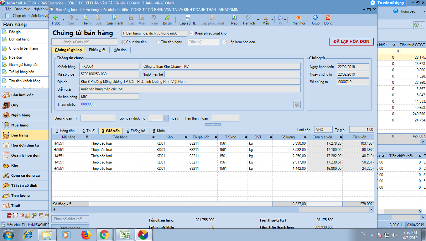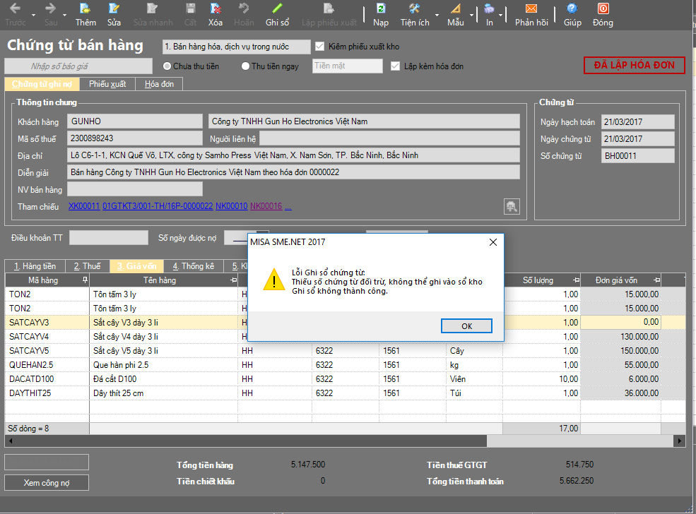 Mua sắt V3 ngày 21/02/2017, sau đó bán ra ngày 21/03/2017, nhưng giá vốn không tự động cập nhật. Còn hiện cả bảng thông báo không cho lưu chứng từ. Nhờ ad hỗ trợ trường hợp này!