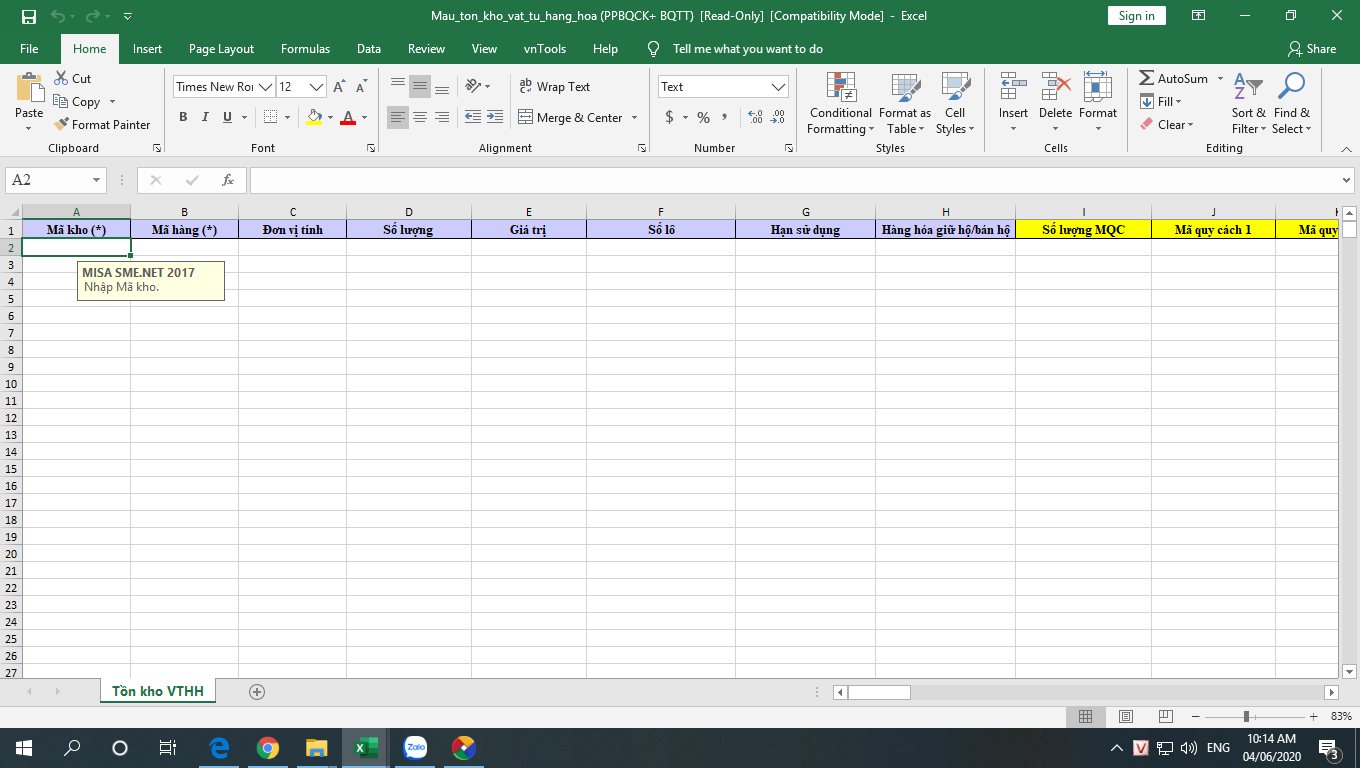 Thưa anh/chịchị ơi. ở dữ liệu cũ mình vào tổng hợp tồn kho để xuất khẩu dữ liệu để lấy số dư tồn kho đến 31/5/2020 phải không ạ. khi em tải tệp excel mẫu xuống thì mục xuất khẩu dữ liệu ở excel cũ không thấy hiện mục mã kho chị ạ