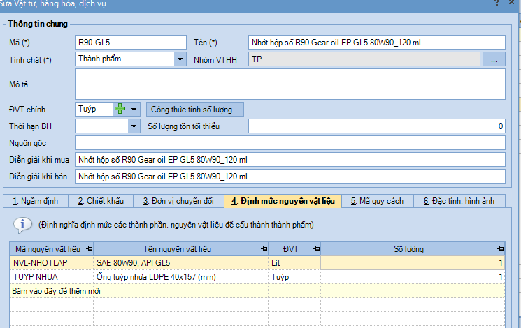 Thưa anh/chịBên em là nhập 1 bồn 1000 lít về chiết thành 1 tuýp nhỏ 120ml thì mình làm bên Định mức NVL và Đơn vị chuyển đổi sao cho đúng ạ,