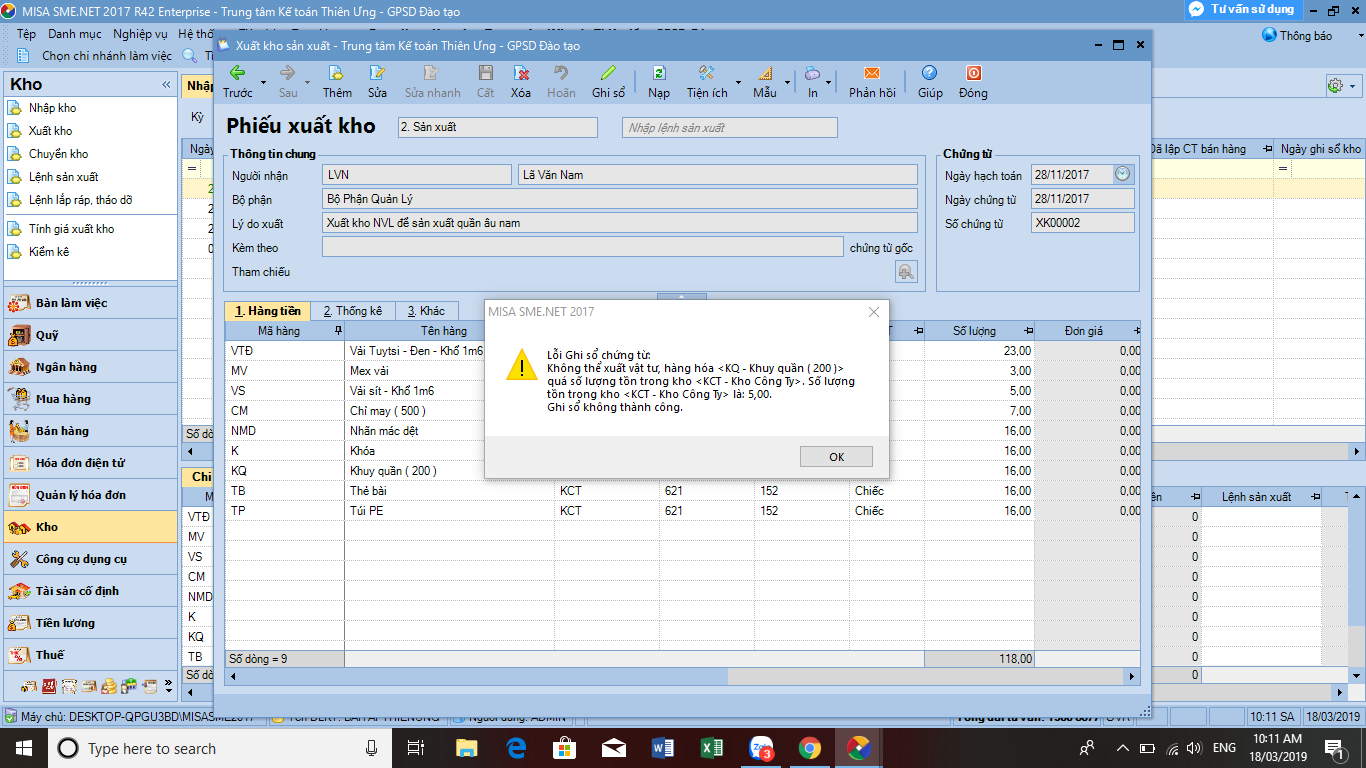 Đối với vấn đề này, anh/chị kiểm tra thử BC tồn kho tới ngày xuất là 28/11/2017 mặt hàng đó còn tồn bao nhiêu với đơn vị tính là chiếc, và trên chứng từ xuất kho, anh/chị chọn mẫu/mẫu nhiều đơn vị tính để xem thử tỷ lệ quy đổi ra đúng chưa, nếu hàng còn tồn trùng ngày xuất thì anh/chị sửa giờ xuất lại sau giờ nhập thử được không nhé.