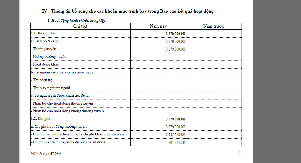 biểu mẫu B04/BCTC thuyết minh báo cáo tài chính phần IV. Thông tin bổ sung cho các khoản mục trình bày trong Báo cáo kết quả hoạt động